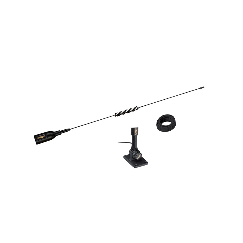 Dotata di un cavo coassiale integrato RG58C/U di 6m (20’) e di uno stilo nero flessibile in acciaio che presenta un design a molla per evitare un eccessivo effetto a “frustata”, è un antenna resistente e sicura.