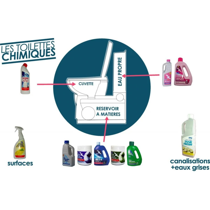 Versate 60 ml di Elsan doppio risciacquo (2 litri) nel serbatoio di scarico del vostro WC chimico, per 10 litri di capacità .