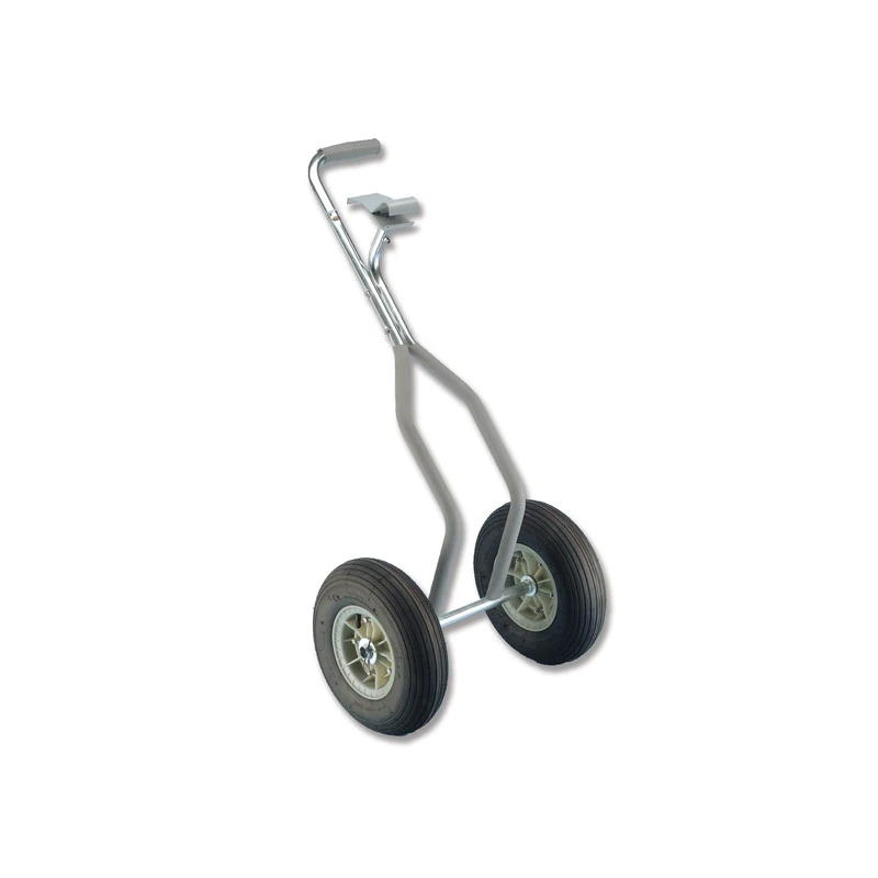 Fabbricato in tubo di acciaio zincato e provvisto di ruote pneumatiche in gomma a larga sezione.