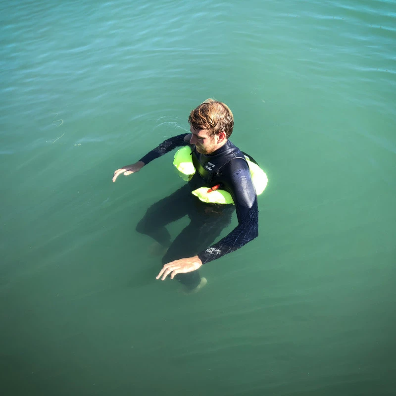 Azionato manualmente, il tubo gonfiabile si sgancia dal marsupio e sostiene l’utente sotto le braccia e intorno al petto.