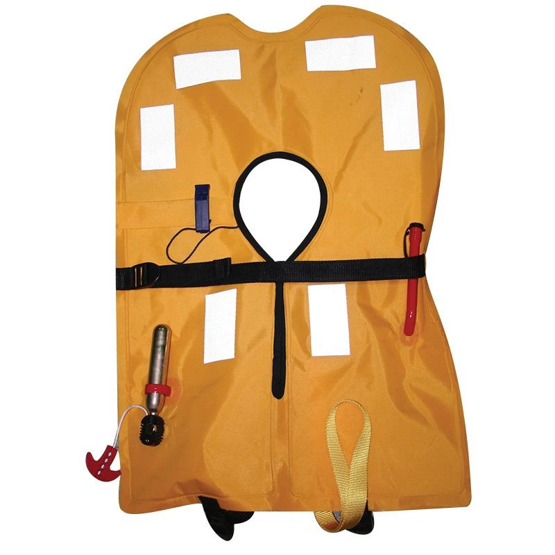 Giubbotto di salvataggio equipaggiato di bande riflettenti, un fischietto (certificato ISO 12402-7/8) e di una impugnatura di alaggio gialla che facilita le operazioni di soccorso in mare.