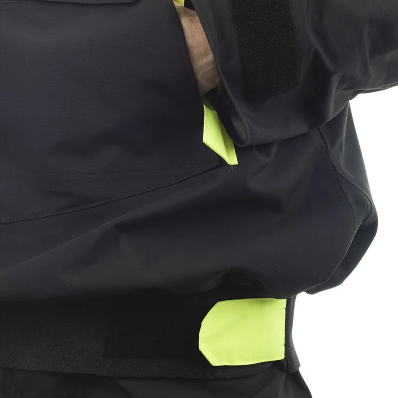La giacca è inoltre dotata di un’ampia tasca frontale con pattine fluorescenti, oltre a una tasca centrale sigillata da una doppia pattina chiusa con velcro per proteggere gli effetti personali dalle intemperie. Un’ampia fascia in neoprene regolabile in vita assicura la massima impermeabilità e una perfetta vestibilità .