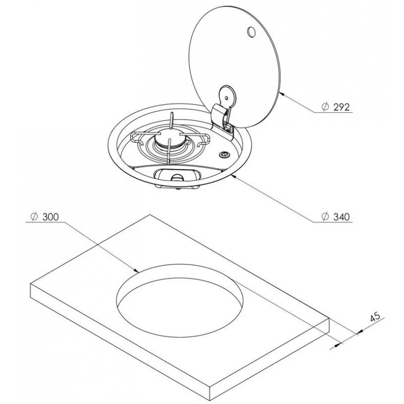 Piano cottura in acciaio inox rotondo ad incasso a gas a 1 fuoco con bruciatore provvisto di coperchietto autobloccante, griglia inox di supporto fissata con gommini anti vibrazione. Coperchio in vetro nero temperato con cerniere a scomparsa. Sul piano è inserita una speciale bussola che è utlizzata come sede del fermapentole a colonna. BRUCIATORI: tutti i bruciatori sono forniti di termocoppia (valvola di sicurezza). AUSILIARIO: portata 1000 W – consumo 73 g/h SEMIRAPIDO: portata 1750 W – consumo 127 g/h RAPIDO: portata 3000 W – consumo 218 g/h