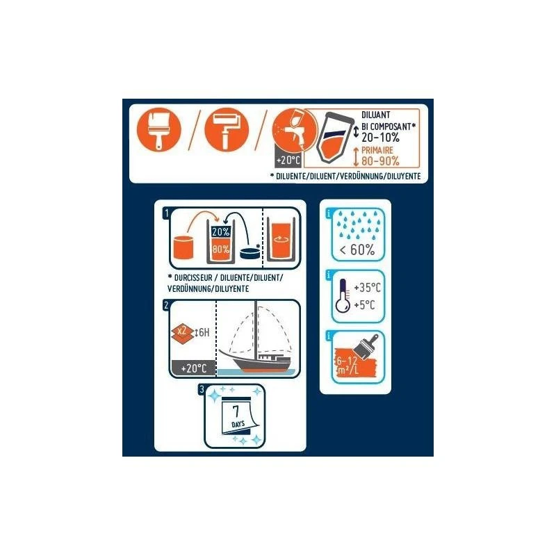 PRMER EPOSSIDICO BI-COMPONENTE ORANGEMARINE è un primer appositamente formulato per gli ambienti marini su tutte le superfici, sopra e sotto la linea di galleggiamento. Fornisce una superficie ideale prima dell’applicazione dell ‘antivegetativa. Fornisce inoltre una protezione anticorrosione in ambienti aggressivi, in particolare per pesi e chiglie.