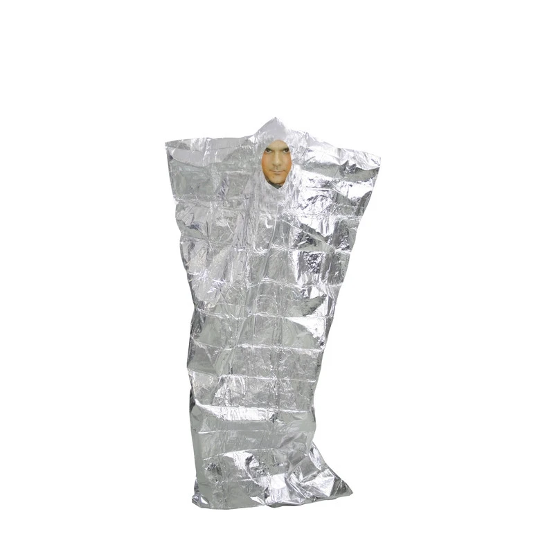 Sacco di Sopravvivenza Termoprotettivo alluminio norma LSA ideale per proteggere l’utilizzatore contro pioggia, vento e freddo.