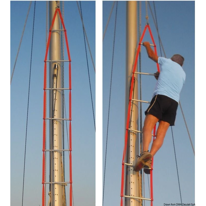 La scala deve essere innanzitutto fissata in basso ai due passanti predisposti (idealmente va fissata al di sotto dell’attacco del boma), poi va tesata con una drizza e l’utilizzo di un winch. In questo modo la scala resta rigida e immobile, anche grazie a un sistema di autobloccaggio dei singoli gradini. Non avrai dunque problemi se ti sbilancerai.
