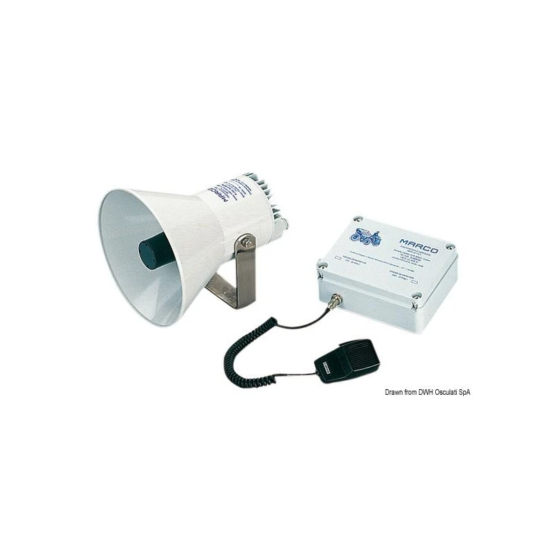 Clacson elettronico di facile montaggio, basta collegare due cavi tra il clacson e la centralina. Con staffa di supporto in acciaio inox lucidato. Dotato di amplificatore vocale per la trasmissione di messaggi vocali + segnale automatico di nebbia + ingresso VHF, microfono incluso. Omologato RINA perimbarcazioni da diporto e professionali da 12 a 20 metri.